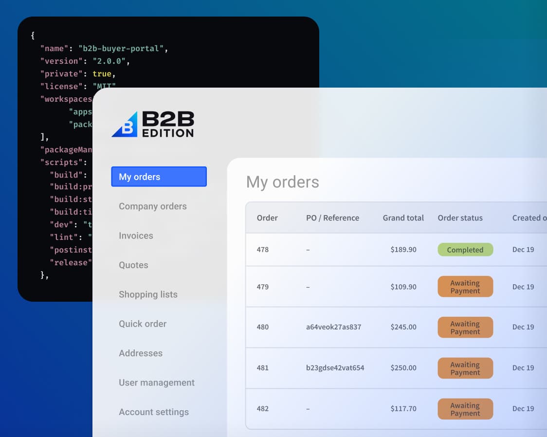 Köparportalen med öppen källkod låter dina kunder enkelt hantera sina konton och lägga nya beställningar. Anpassa upplevelsen efter dina exakta behov.