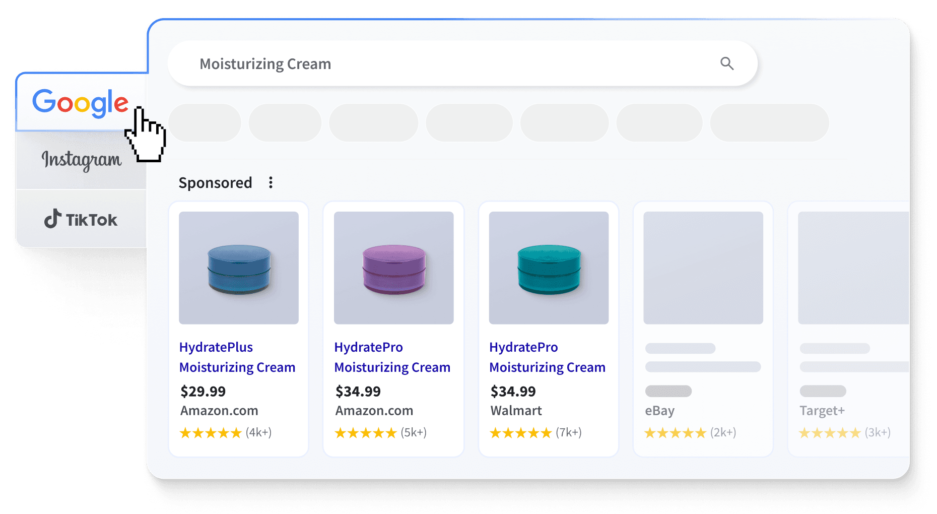 Använd Google, Microsoft, Bing, Facebook, Amazon eller Criteo för att köpa displayannonser för att utöka räckvidden för dina produkter bortom sökkanalerna och nå alla potentiella kunder, var du än riktar in dig.
