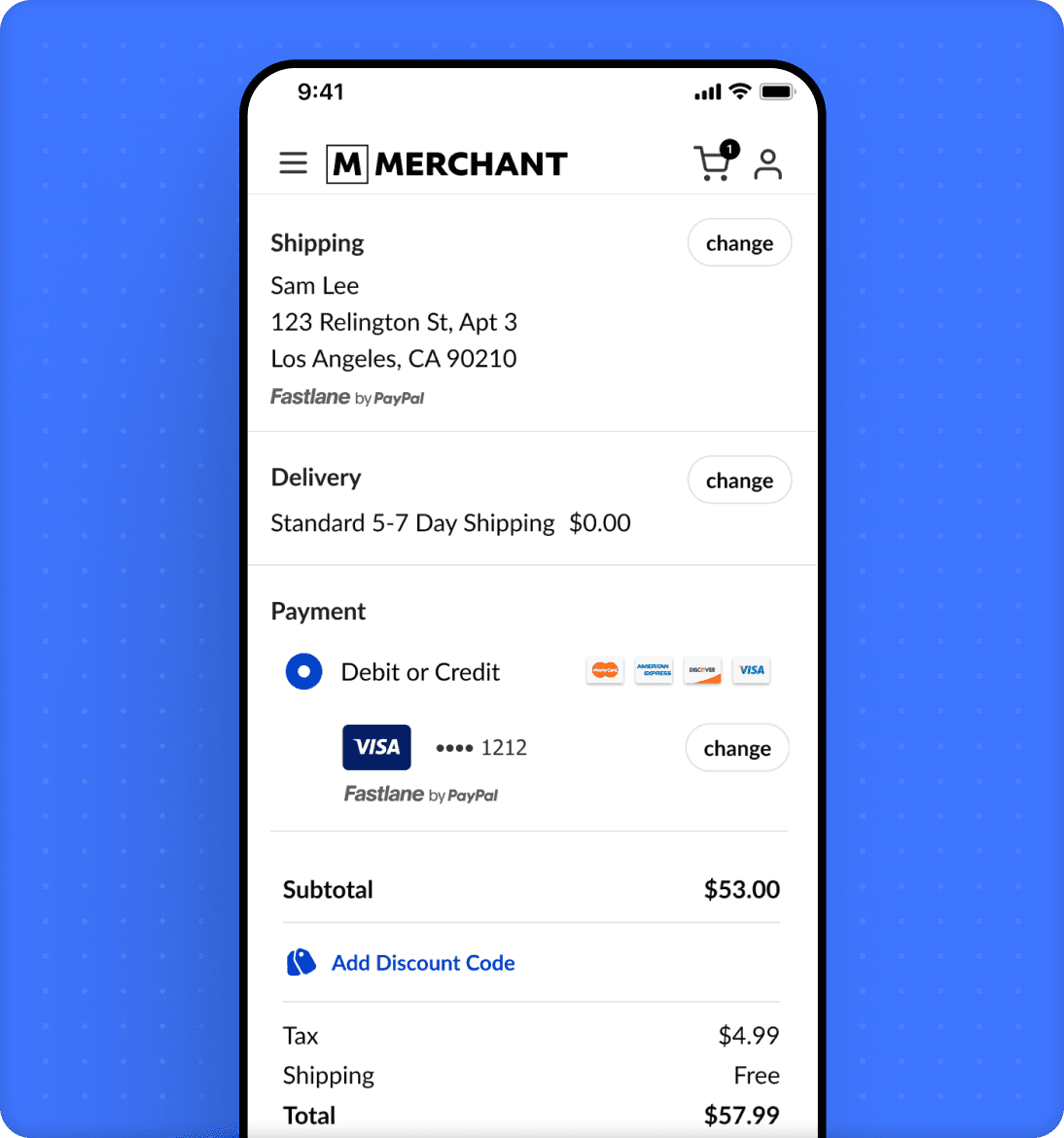 Med PayPal kan ni på ett säkert sätt spara era kunders betalsätt, inklusive PayPal, Venmo, Apple Pay, Google, Pay samt kredit- och bankkort, vilket ger en snabb och enkel kassaupplevelse. Genom att spara kunders betalningsinformation skapas en snabb utcheckning, säljaren kan erbjuda prenumerationer, antalet nekade kort minskar och säkerheten höjs.